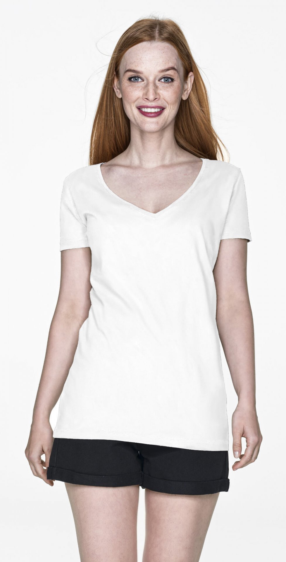 Koszulka posiada charakterystyczne wycięcie przy szyi w tzw “serek”, co pozwala ładnie wyeksponować damski dekolt.